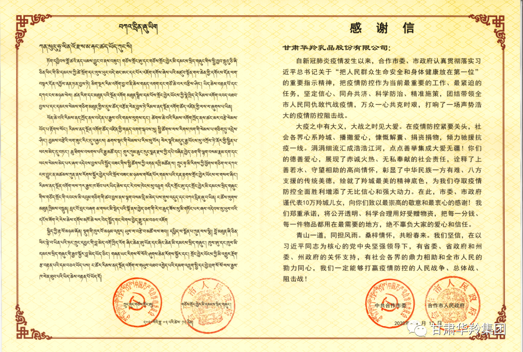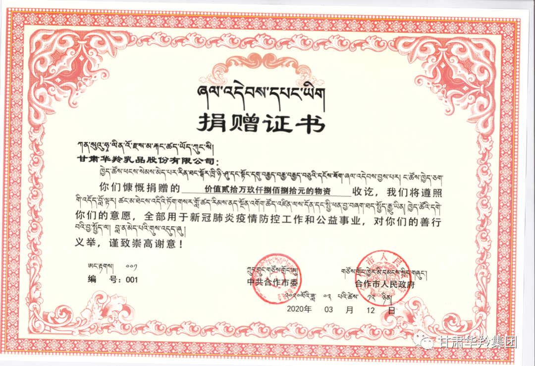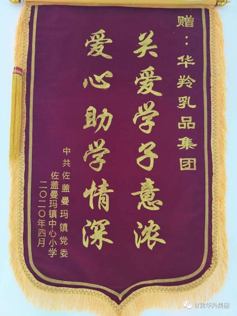 2020年4月份,甘肅華羚乳品股份有限公司為助力佐蓋曼瑪鎮中心小學學生順利開學復課,積極捐贈3500個醫用一次性口罩,彰顯了華羚擔當和企業的社會責任, 2020年5月13日,佐蓋曼瑪鎮黨委、佐蓋曼瑪鎮中心小學相關領導贈予甘肅華羚乳品股份有限公司“關愛學子意濃,愛心助學情深”錦旗一面,表達了佐蓋曼瑪鎮中心小學全體師生對華羚公司的感謝和信任。 春風送暖,愛心啟程。當疫情最為嚴重時,甘肅華羚乳品股份有限公司向合作市民政局捐贈30余萬元的牦牛奶粉,為打贏疫情攻堅戰提供了物資保障,積極踐行了企業社會責任,為疫情防控工作貢獻力量,為眾多疫情防控一線工作者的健康保駕護航。