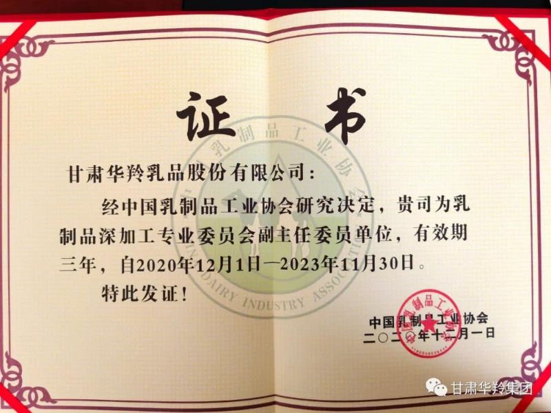 在乳制品深加工產品科學發展論壇暨乳制品深加工專業委員會成立大會上,甘肅華羚乳品股份有限公司被中國乳制品工業協會乳制品深加工專業委員會聘為副主任委員單位,甘肅華羚乳品股份有限公司董事長敏永祥受聘為中國乳制品工業協會乳制品深加工專業委員會副主任委員。