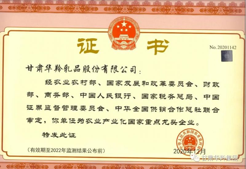 甘肅華羚乳品股份有限公司連續(xù)17年榮列“農(nóng)業(yè)產(chǎn)業(yè)化國家重點(diǎn)龍頭企業(yè)”名單